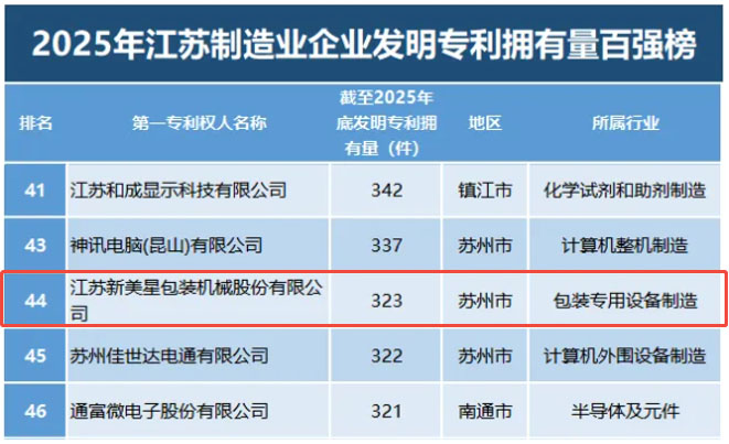 春回大地,好消息傳來!2025年江蘇制造業(yè)企業(yè)發(fā)明專利擁有量百強榜正式揭曉,新美星憑借深厚的技術(shù)積淀與強勁的創(chuàng)新勢能,不負(fù)眾望成功登榜!這是新美星自2022年起,連續(xù)4年榮登該榜單,用實力續(xù)寫創(chuàng)新傳奇,在包裝專用設(shè)備制造領(lǐng)域的創(chuàng)新賽道上持續(xù)領(lǐng)跑、一馬當(dāng)先!