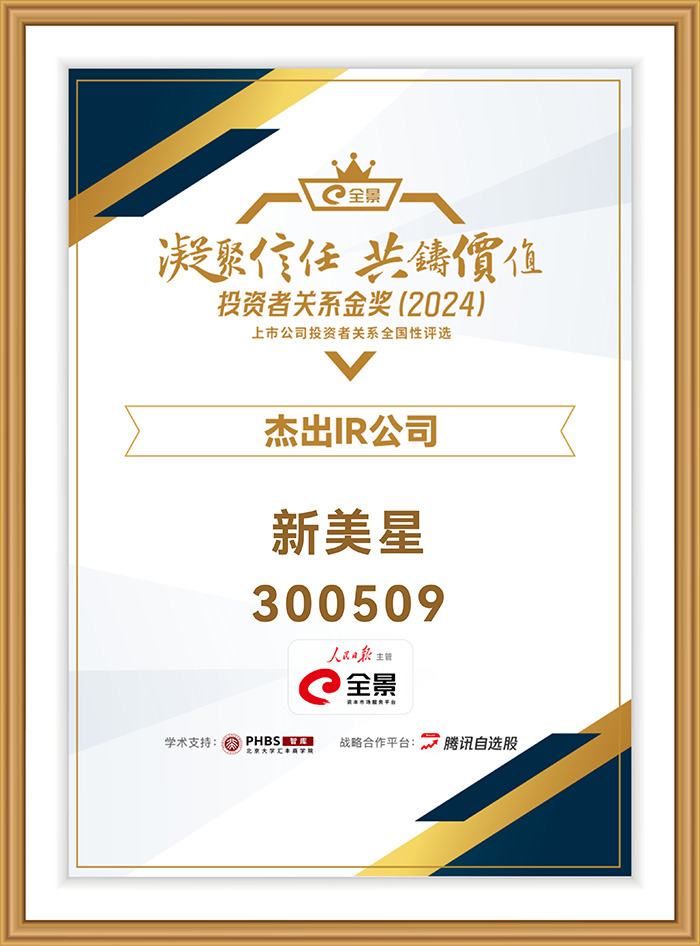 新美星自2016年上市以來,始終高度重視投資者關(guān)系管理,真誠、公開、及時地與投資者進行互動,搭建起雙向溝通的橋梁,樹立了向新而行、向美而上的良好企業(yè)形象,有力提升了公司的公信力和影響力。新美星將以此次獲獎為契機,努力提升投資者關(guān)系管理能力,形成更加透明、專業(yè)、創(chuàng)新的投資者關(guān)系管理范式,積極應(yīng)對資本市場的快速變化,滿足投資者日益多元化的需求。同時,公司也將進一步加大技術(shù)創(chuàng)新和管理創(chuàng)新力度,進一步規(guī)范內(nèi)部治理,努力以良好的經(jīng)營業(yè)績回饋廣大投資者的信任和厚愛,與投資者共成長、贏未來!為中國裝備制造業(yè)的發(fā)展壯大貢獻“星”力量!