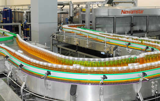 噴淋殺菌機(jī)采用熱水噴淋殺菌和逐步降溫冷卻的五段式處理。設(shè)備配置有自動(dòng)加氯泵,可根據(jù)補(bǔ)水量調(diào)節(jié)加氯量。熱水由蒸汽加熱裝置產(chǎn)生,使用后的水流入機(jī)架水槽,由噴淋泵循環(huán)使用。若熱水溫度達(dá)不到設(shè)定溫度,由加熱裝置再對(duì)其適當(dāng)加溫。若熱水溫度超過設(shè)定溫度,則由循環(huán)泵送至車間外的冷卻塔冷卻后再循環(huán)使用。噴淋殺菌機(jī)的進(jìn)出口采用動(dòng)態(tài)過渡,減少擠壓倒瓶及人工干預(yù)。